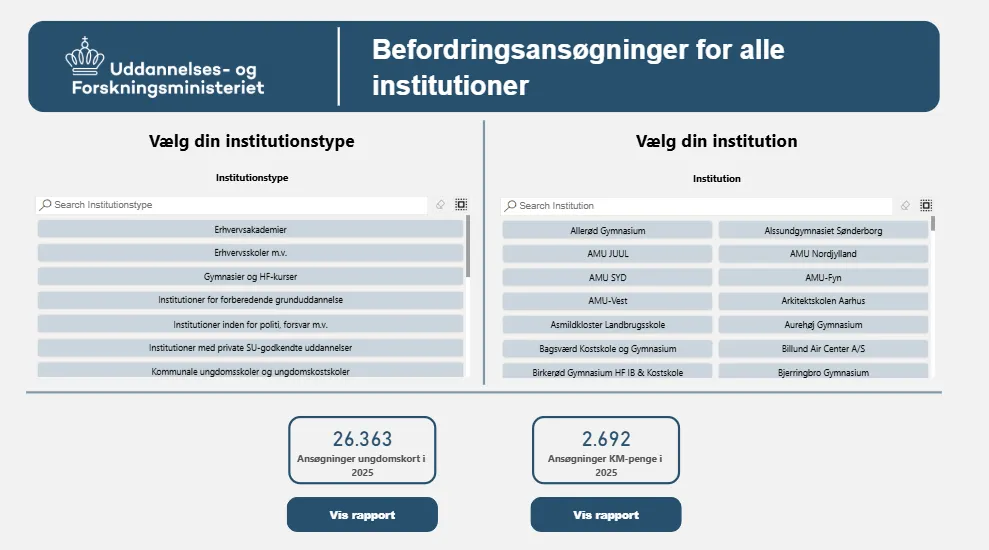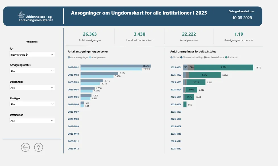 Rapporten indeholder blandt andet opgørelser over antal ansøgninger om Ungdomskort og kilometerpenge