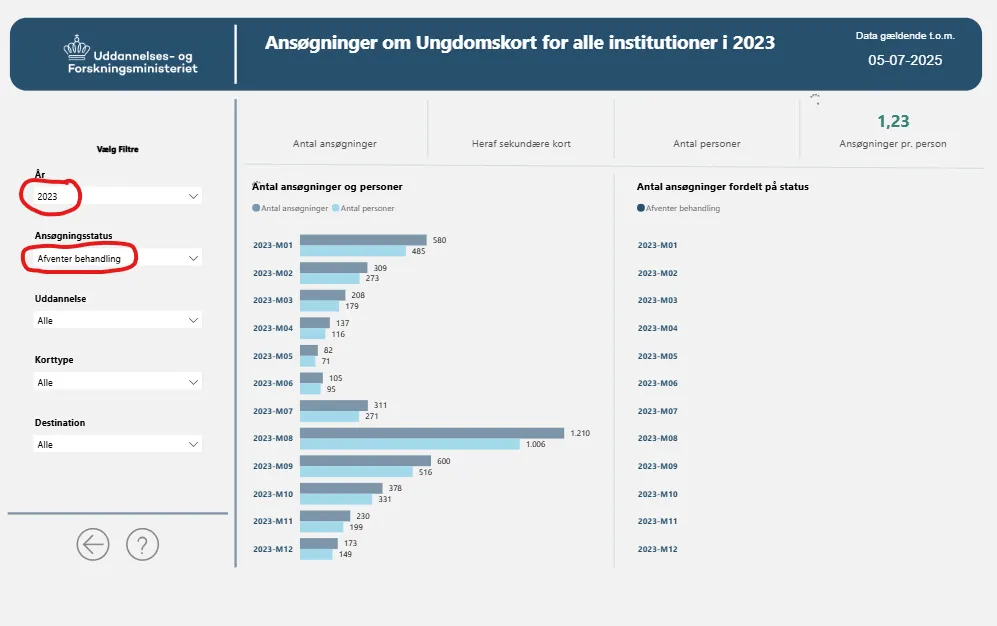 I hver rapport er der en række filtre til venstre, som du kan specificere din visning med. I nedenstående eksempel er år 2023 valgt sammen med filtret Afventer behandling. Disse filtre giver en visning, hvor du kan se, hvor mange ansøgninger og ansøgere, der afventer behandling.