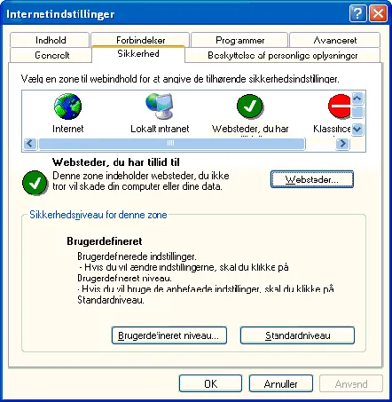 - Udpeg sikkerhedszonen ("Internet" eller "Websteder du har tillid til")