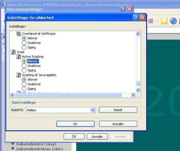 Du skal tillade "Active Scripting" i din browser for den sikkerhedszone som du har placeret styrelsens server i (normalt zonen "Internet" eller "Websteder du har tillid til").